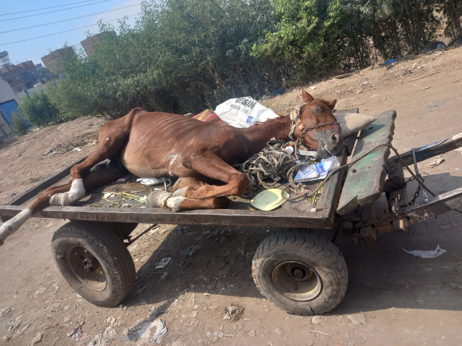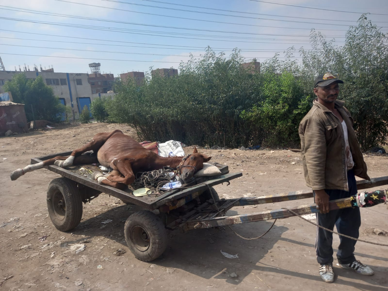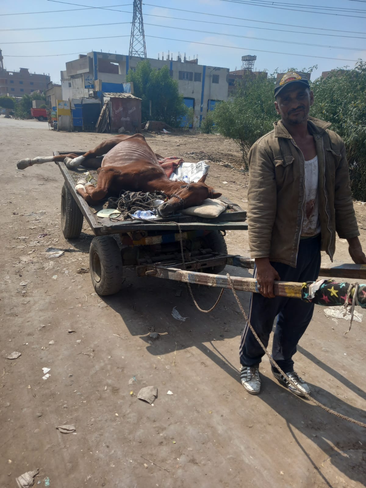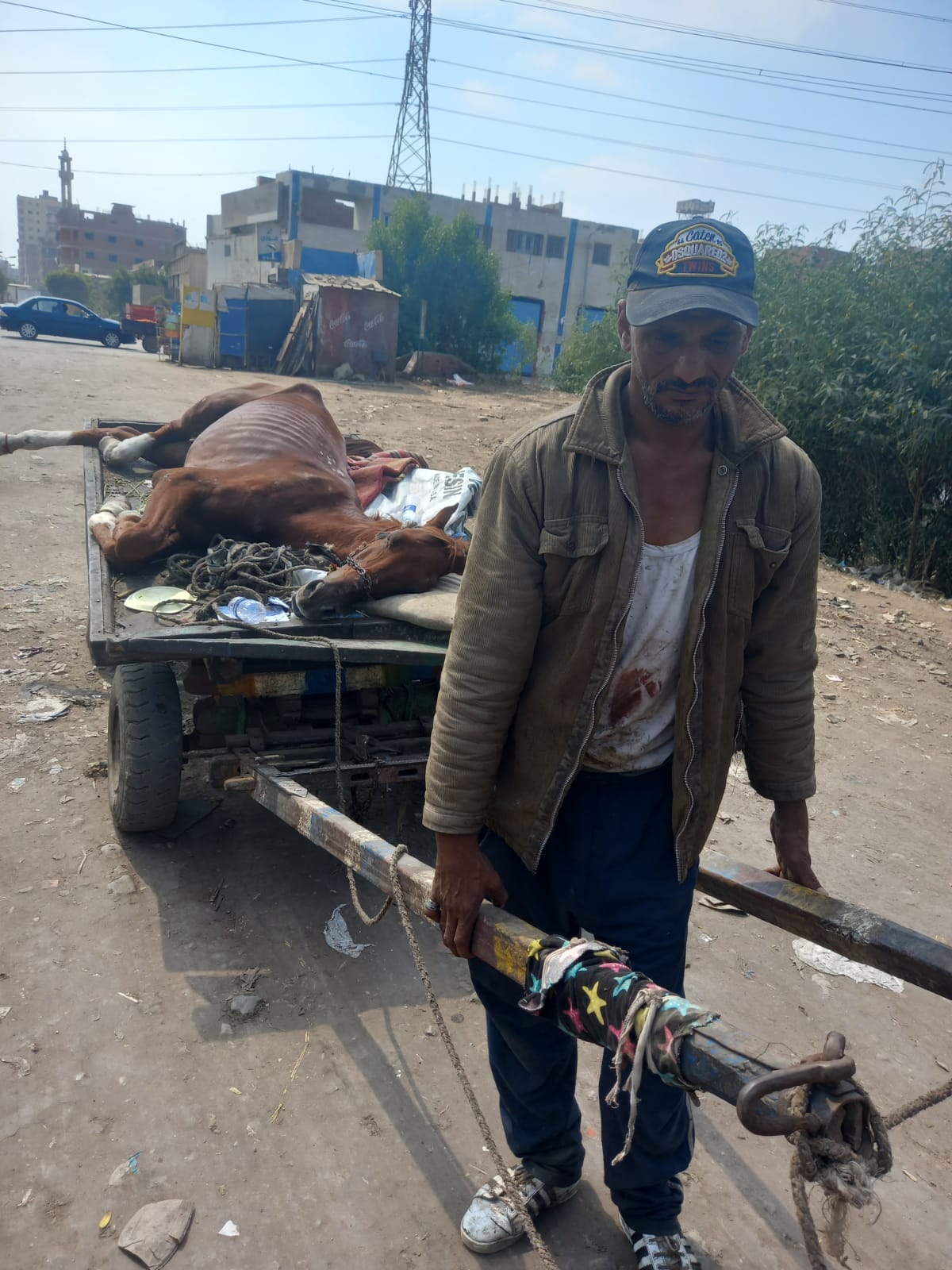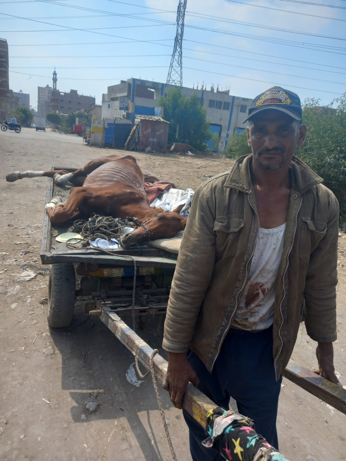 قال حسنين دسوق، 46 عاما، إنه يعمل عربجي، جامعًا للقمامة والتراب وغيرهم، وفي صباح يوم الأربعاء بتاريخ 6 أكتوبر، استيقظ مثل كل يوم، مستقلا عربته باحثًا عن لقمة عيشه، وبشكل مُفاجئ سقط حصانه نتيجة تعرضه لقطع بأوتار قدمه.