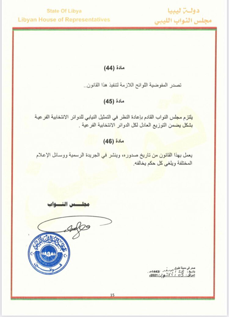 أقر مجلس النواب الليبي، قانون الانتخابات البرلمانية الليبية، والذي تضمن العديد من مواد القنون السابق الذي جرى اتباعه خلال الانتخابات التشريعية عام 2014، إلا أنه نص على إلزام البرلمان المقبل على إعادة تشكيل الدوائر الانتخابية عقب تشكيله.