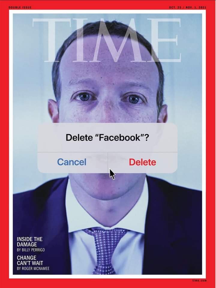 نشرت مجلة تايم الأمريكية على صفحتها الرئيسية، صورة تظهر مؤسس موقع التواصل الاجتماعي فيسبوك، مدون عليها عبارة تشير إلى إمكانية حذف موقع التواصل الاجتماعي فيسبوك على خلفية تعطله يوم الاثنين الماضي لأكثر من 6 ساعات.