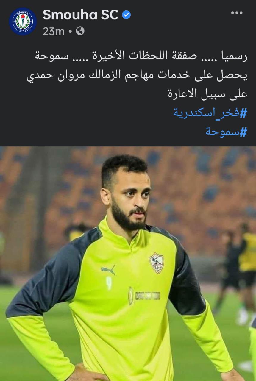 ونشرت الصفحة الرسمية لنادي سموحة، صورة لمهاجم الزمالك مع تعليق: رسميًا، صفقة اللحظات الأخيرة، سموحة يحصل على خدمات مهاجم الزمالك مروان حمدي على سبيل الإعارة.