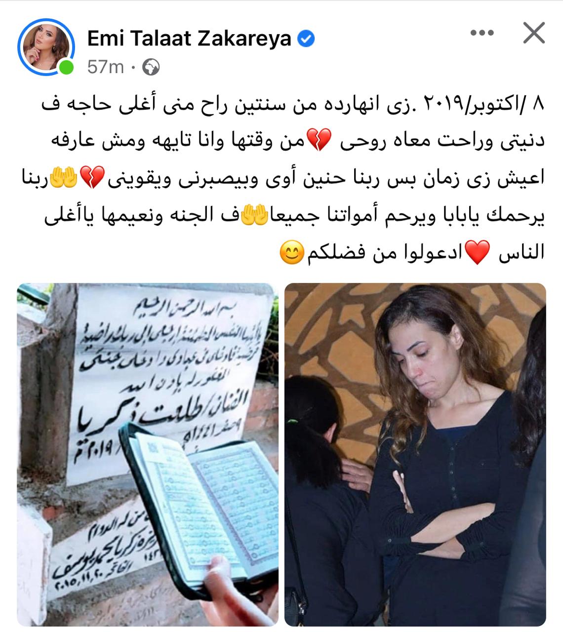 ونشرت إيمي طلعت زكريا صورتين، إحداهما لها من عزاء والدها والآخرى من أمام قبره، وذلك عبر حسابه على موقع التواصل الاجتماعي فيس بوك، وكتبت: زي انهاردة من سنتين راح مني أغلى حاجة في دنيتي وراحت معاه روحي.