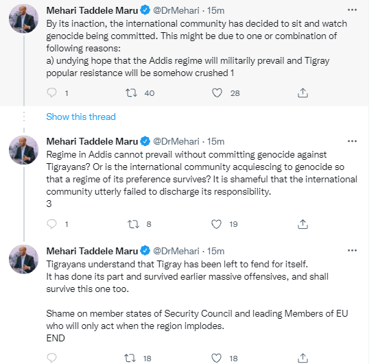 وقال الباحث الإثيوبي عبر حسابه الرسمي على تويتر، إن شعب تيجراي يفهم أن التيجراي تُركت لتدافع عن نفسها، مضيفا أنها أدت دورها ونجت من هجمات ضخمة سابقة، وسوف تنجو من هذا الهجوم أيضًا، عار على الدول الأعضاء في مجلس الأمن والدول الأعضاء القيادية في الاتحاد الأوروبي الذين لن يتصرفوا إلا عندما تنهار المنطقة من الداخل.