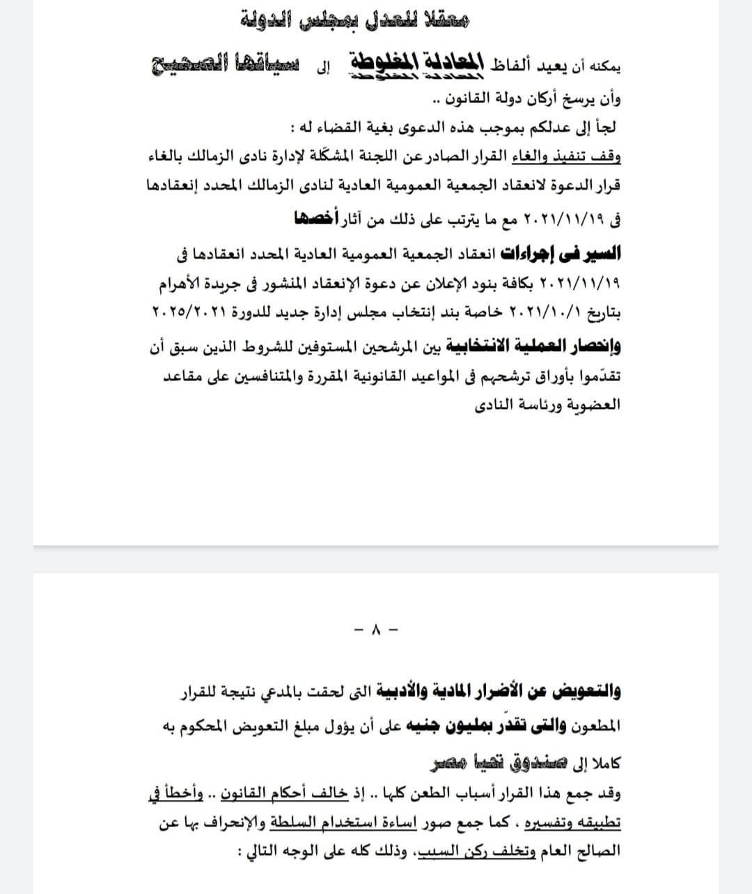 وطالب عمر هريدي، في الدعوى، السير في إجراءات انعقاد الجمعية العمومية المحدد لها 19 نوفمير، والمتضمنة إجراء الانتخابات، وانحصار العملية الانتخابية على المرشحين الذين تقدموا بأوراق ترشحهم عقب فتح باب الترشح يوم 2 أكتوبر، وتعويضًا عن الأضرار المالية والأدبية بقيمة مليون جنيه، على أن يؤول المبلغ إلى صندوق تحيا مصر.