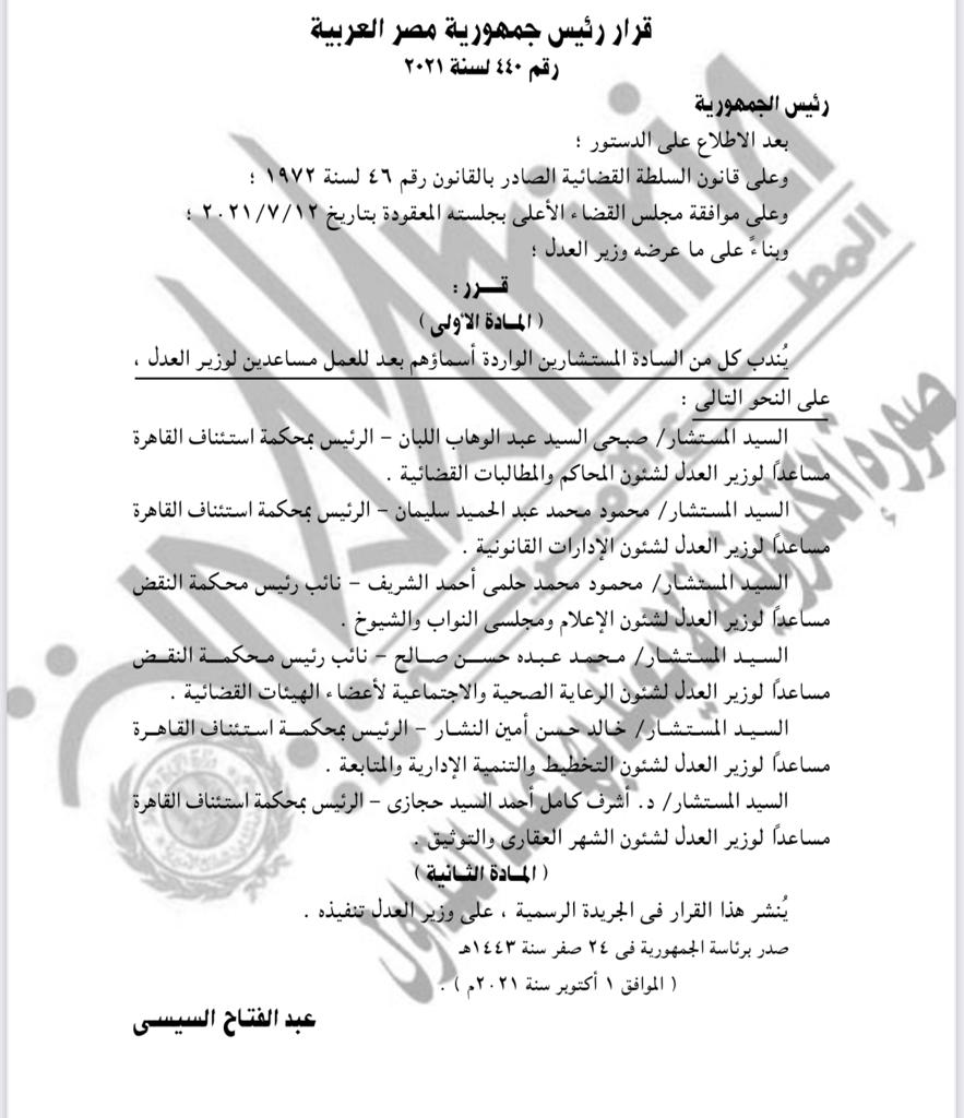 أصدر الرئيس عبد الفتاح السيسي قرارا رقم 440 لسنة 2021، بندب 6 مستشارين للعمل مساعدين لوزير العدل، ونشر القرار بالجريدة الرسمية صباح اليوم.