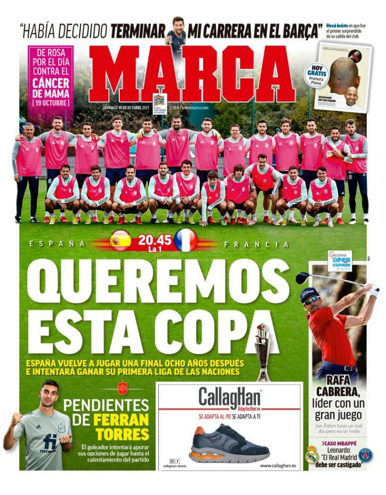 عنونت صحيفة آس الإسبانية غلافها، بعنوان فـريق رائع ضد جلاكتيكوس، إسبانيا مع الشباب وفرنسا بقيادة جريزمان ومبابي وبنزيمة يتنازعون على نهائي دوري الأمم، في إشارة إلى المباراة النهائية التي ستلعب مساء اليوم الأحد.