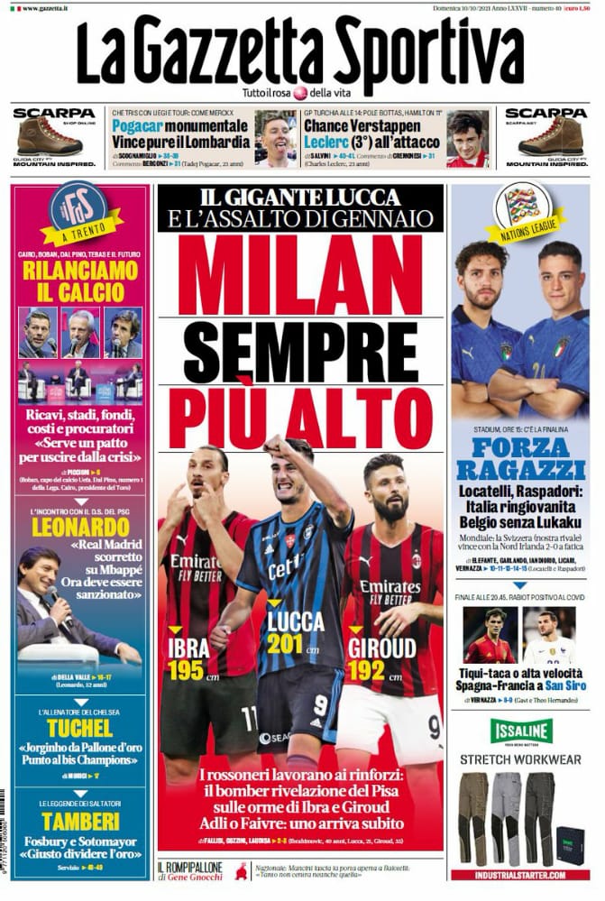 تصدر العنوان ميلان دائمًا أعلى، غلاف صحيفة لا جازيتا للعدد الصادر عن اليوم الأحد، وذلك مع تحديد صفقات الروسونيري الشتوية، كما شجعت الصحيفة منتخب إيطاليا قبل مباراة مع بلجيكا تحت عنوان هيا يا فتيان.