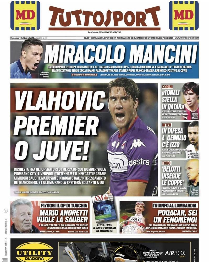 عنونت صحيفة توتو سبورت الإيطالية صفحتها الأولى بمعجزة مانشيني، وذلك في إشارة بأن الظروف تخدم إيطاليا للفوز بالمركز الثالث في دوري الأمم بعد إصابة لوكاكو أمس وقبله هازارد.