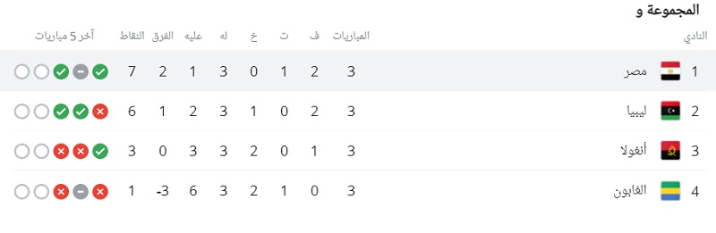 احتل المنتخب المصري الأول الصدارة في جدول الترتيب برصيد 7 نقاط يليه منتخب ليبيا في المركز الثاني برصيد 6 نقاط، ثم منتخب أنجولا في المركز الثالث برصيد 3 نقاط، وأخيرًا منتخب الجابون بنقطة واحدة.