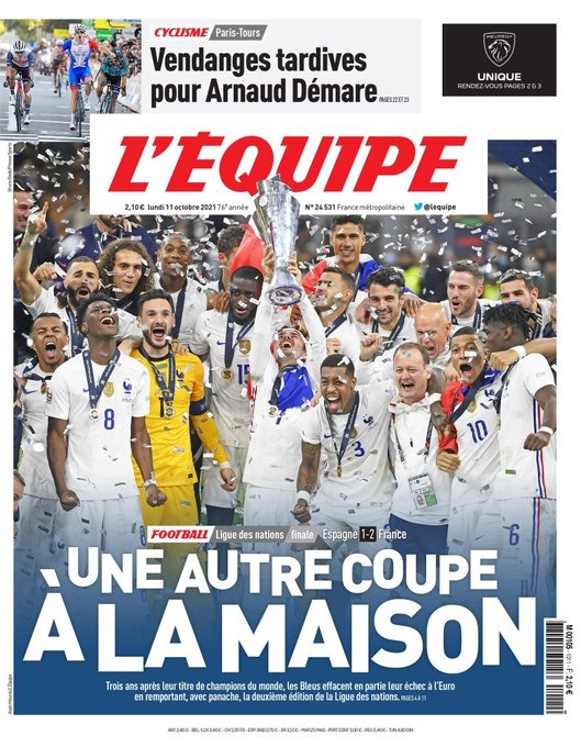 تصدر العنوان كأس جميل آخر إلى الوطن غلاف صحيفة ليكيب الفرنسية بعد فوز منتخب فرنسا على حساب إسبانيا بهدفين مقابل هدف في نهائي دوري الأمم الأوروبية.