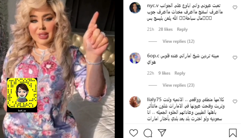 فانهالت عليها العديد من التعليقات الساخرة وكان منها: "وانا مسوية نفسي ملكة الانسانية واتكلم على إلى يتنمرون عليها ليتني كنت ساكته بس".