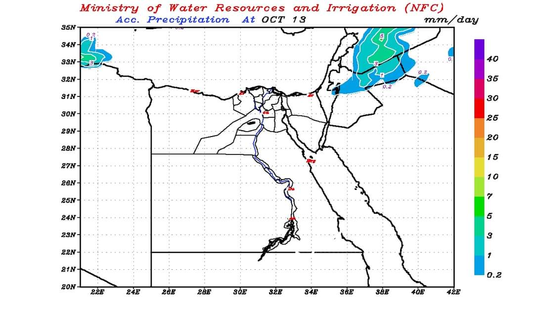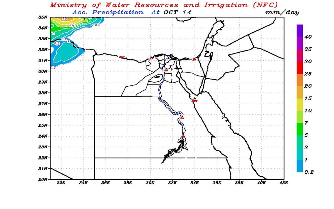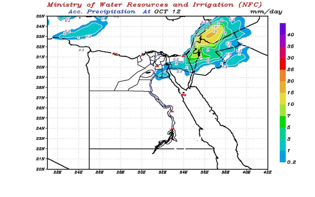 نشر مركز التنبؤ بفيضان النيل في وزارة الموارد المائية والري، خرائط التنبؤ بالأمطار على أنحاء الجمهورية خلال الفترة من اليوم الثلاثاء 12 أكتوبر حتى الخميس 14 أكتوبر 2021.