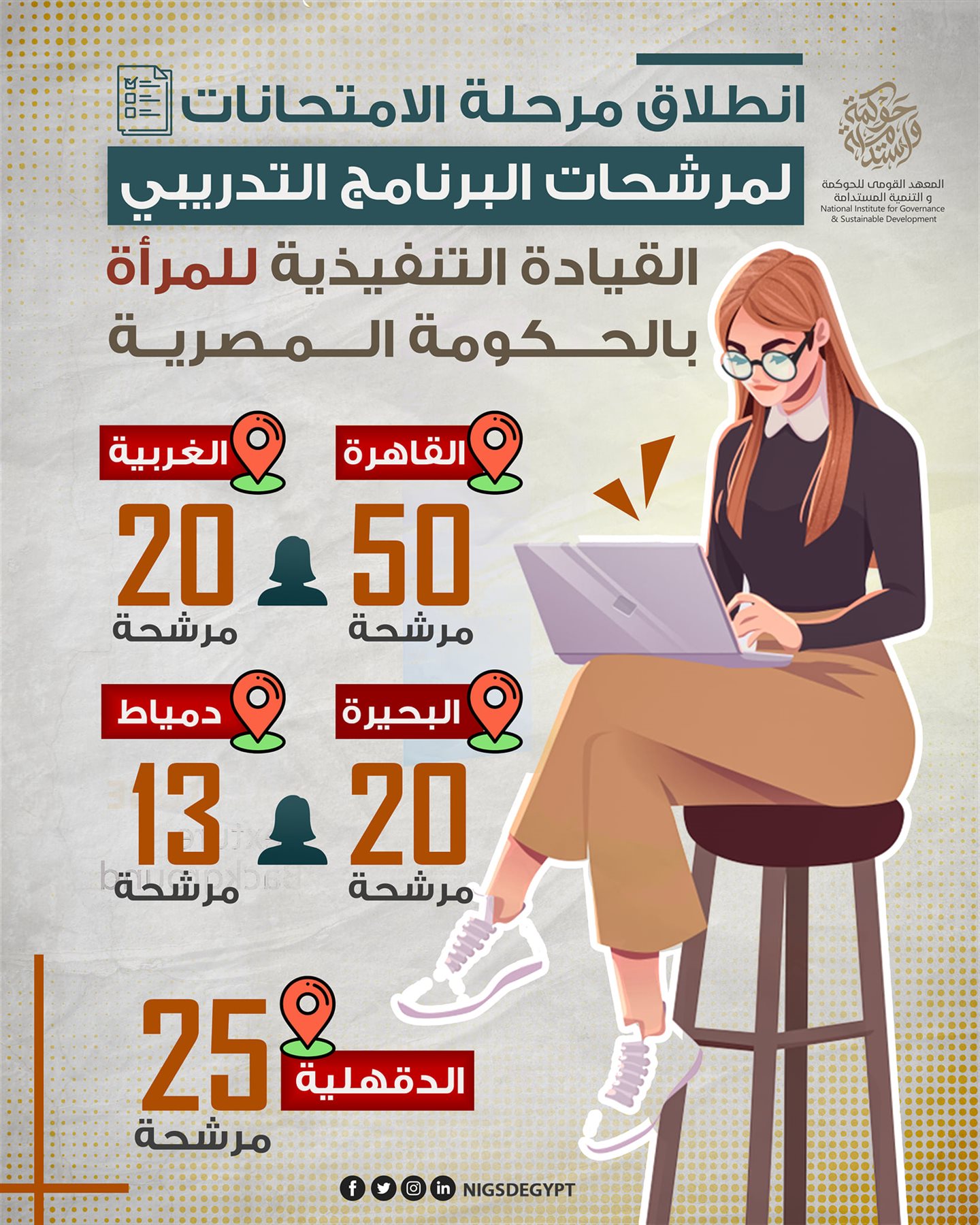أعلن المعهد القومي للحوكمة والتنمية المستدامة، الذراع التدريبية لوزارة التخطيط والتنمية الاقتصادية، بداية مرحلة الامتحانات للبرنامج التدريبي - القيادة التنفيذية للمرأة بالحكومة المصرية.
