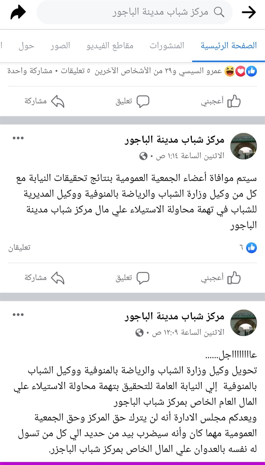 ونشرت الصفحة الرسمية لمركز شباب الباجور منشورًا آخر، يخاطب فيه المواطنين، مؤكدًا على أنه سيتم موافاة الجمعية العمومية بنتائج تحقيقات النيابة العامة مع وكيل وزارة الشباب والرياضة ووكيل المديرية لشباب في تهم محاولة الاستيلاء على المال الخاص بمركز الشباب.