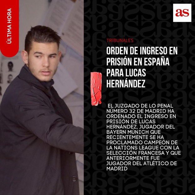 وكشفت صحيفة آس الإسبانية، أن المحكمة الجنائية في مدينة مدريد أمرت بسجن اللاعب الفرنسي لوكاس هيرنانديز، نجم فريق بايرن ميونخ.