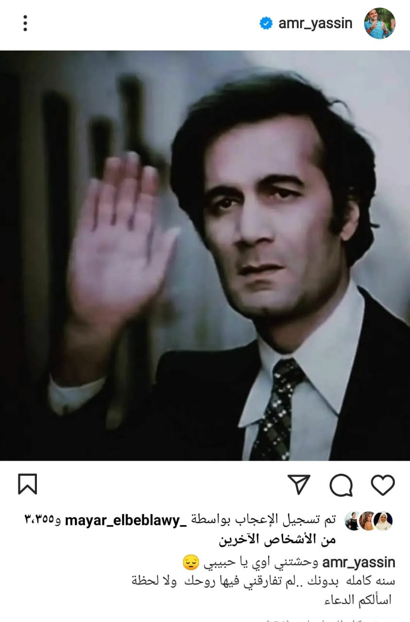 وكتب عمرو محمود ياسين صورة للراحل، عبر حسابه الشخصي بموقع تبادل الصور والفيديوهات انستجرام، وعلق عليها قائلًا: وحشتني أوي يا حبيبي.. سنة كاملة بدونك لم تفارقني فيها روحك ولا لحظة.