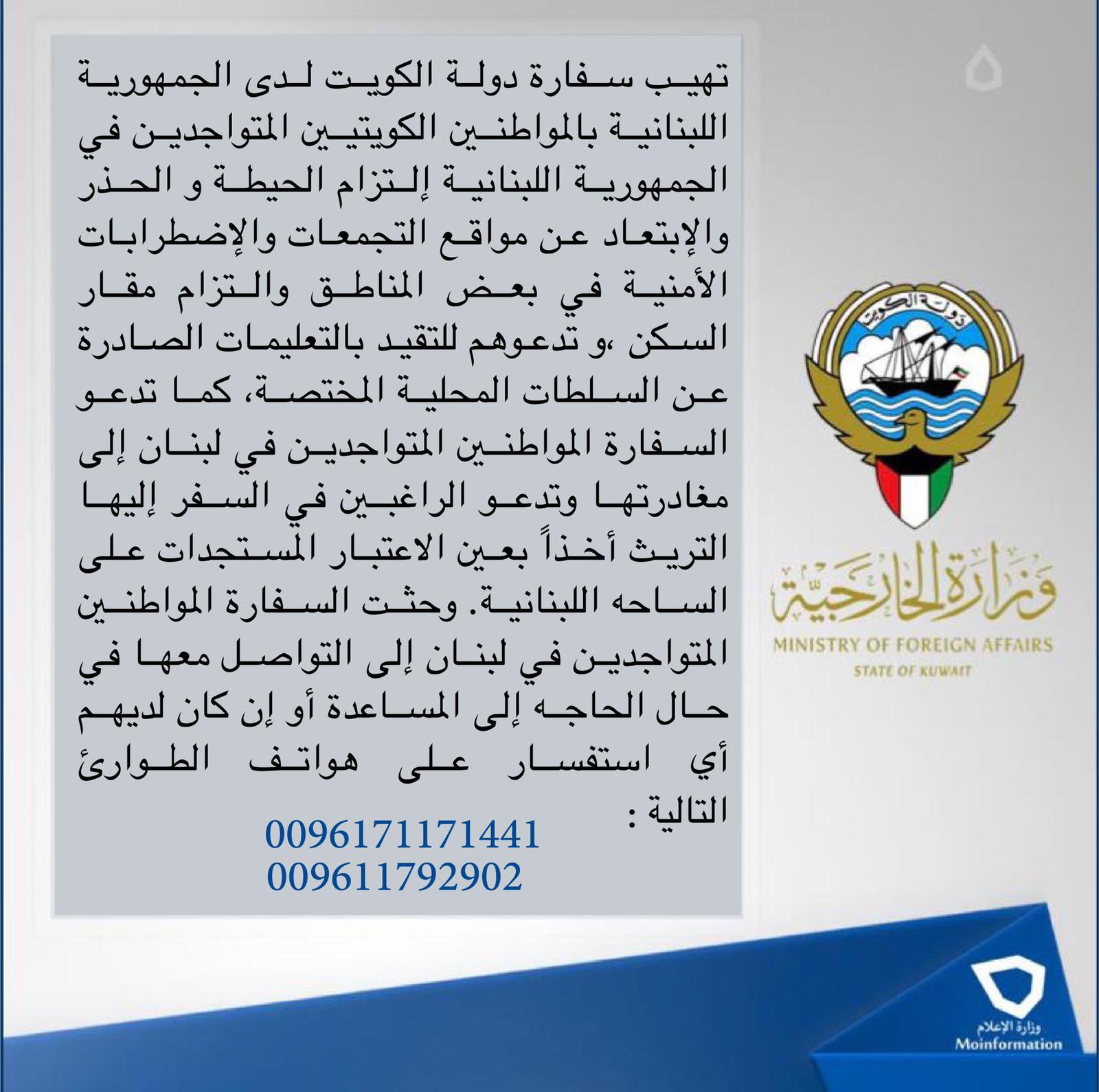 كما دعت السفارة المواطنين الكويتيين المتواجدين بدولة لبنان، التقيد بالتعليمات الصادرة عن السلطات المحلية، ومغادرة لبنان في اقرب فرصة ممكنة، مطالبة الكويتيين الراغبين بالسفر إلى لبنان التريث.