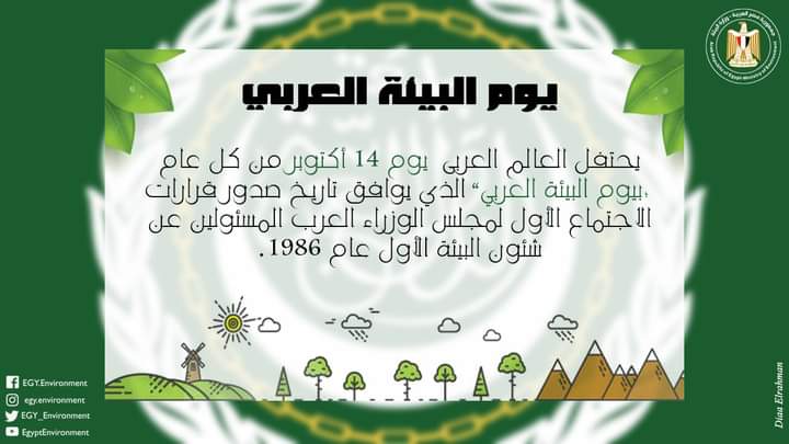 تحتفل الدول العربية، باليوم العربي للبيئة في 14 أكتوبر من كل عام، ويتزامن هذا الاحتفال مع تولي مصر رئاسة مجلس وزراء البيئة العرب ال32.