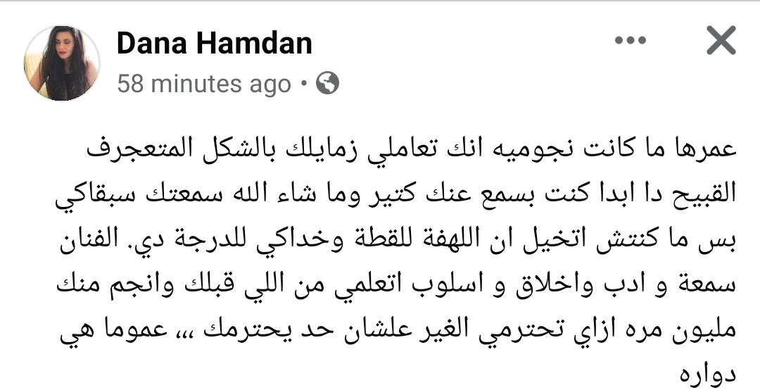 وكتبت دانا حمدان عبر حسابها بموقع التواصل الاجتماعي فيس بوك: عمرها ما كانت نجوميه إنك تعاملي زمايلك بالشكل المتعجرف القبيح ده أبدا، كنت بسمع عنك كتير، وما شاء الله سُمعتك سبقاكي، بس ما كنتش أتخيل إن اللهفة للَّقطة واخداكي للدرجة دي.