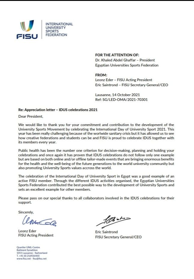تسلم الاتحاد الرياضي المصري للجامعات رسالة من نظيره الدولي تضمنت خطاب شكر من أوليج ماتيتسين، رئيس الاتحاد الدولي للرياضة الجامعية، وموقع من ليونز إيدر، نائب رئيس الاتحاد الدولي للرياضة الجامعية وإيريك سانتروند السكرتير العام موجه إلي الدكتور خالد عبد الغفار رئيس الاتحاد الرياضي المصري للجامعات بشأن نشاط الاتحاد المصري خلال اليوم العالمي للرياضة الجامعية، إلى جانب تقديم الشكر لكل فريق العمل بالاتحاد الرياضي المصري للجامعات.