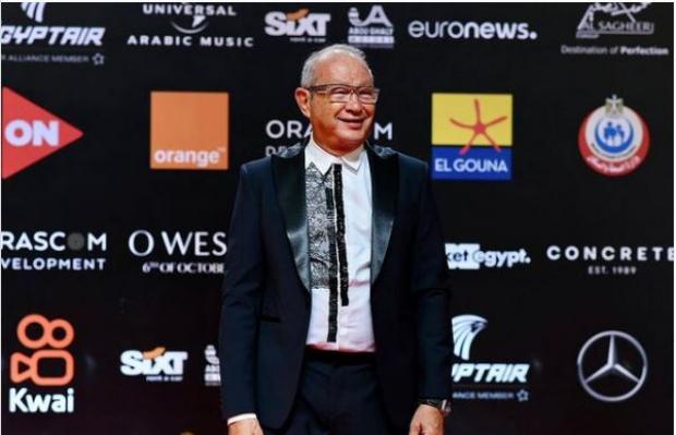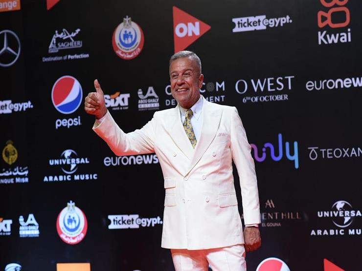 ظهر الفنان شريف منير ببدلة بسيطة بيضاء وربطة عنق ذهبي مشجر، تألق بها على السجادة الحمراء.
