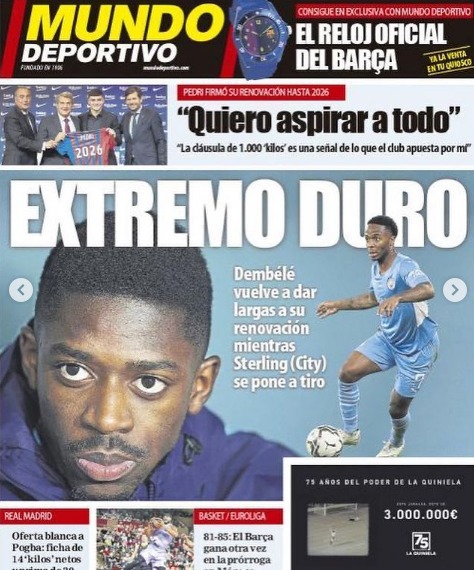 عنونت صحيفة موندو ديبورتيفو الإسبانية غلافها بـ نهاية صعبة، وذلك في إشارة إلى أن عملية خروج الفرنسي عثمان ديمبلي من برشلونة ستكون صعبة بعد تعثر مفاوضات تمديد عقده مع الفريق.