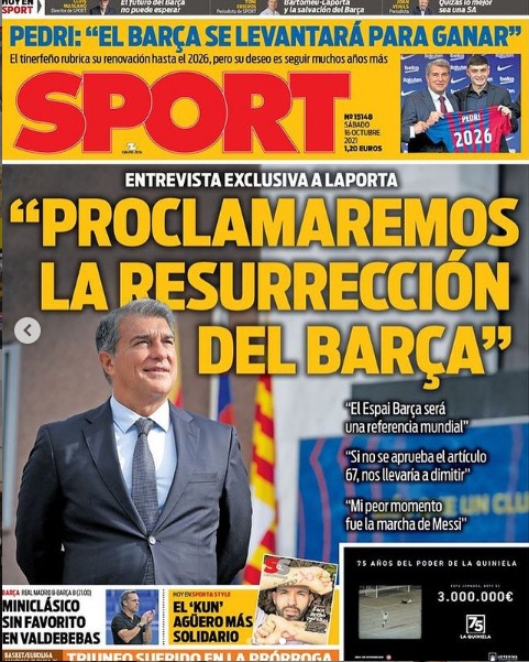سلطت صحيفة سبورت الكتالونية الضوء على المقابلة التي تمت مع خوان لابورتا رئيس نادي برشلونة، وذلك في إشارة منه أنه أُجبر على رحيل ميسي لإكمال رحلة برشلونة وعدم الوقوع في معاناة مالية بعد ذلك، كما أشارت بأن لابورتا يرحب بميسي في برشلونة في أي وقت.