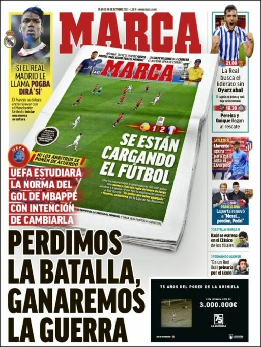 تصدر العنوان لقد خسرنا المعركة، لكننا سنفوز بالحرب، غلاف صحيفة ماركا الإسبانية، وذلك في إشارة منها إلى أن هناك دراسة من الاتحاد الأوروبي لقانونية هدف مبابي في شباك إسبانيا بنهائي دوري الأمم الأوروبية في الفترة الأخيرة.