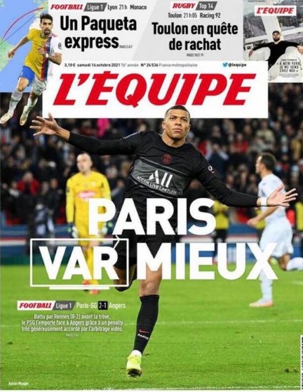 سلطت الصحيفة الفرنسية الضوء على هدف الفرنسي كيليان مبابي من ركلة جزاء في شباك فريق أنجيه، وذلك بعد أن قام الفار باحتساب ركلة جزاء صحيحة للنادي قادته للفوز في اللقاء، تحت عنوان فار أفضل لـ باريس.