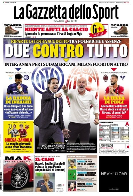 اهتمت صحيفة لا جازيتا ديللو سبورت الإيطالية في غلافها بالحديث عن مباريات قطبي ميلان في الفترة المقبلة، وذلك بعنوان اثنان ضد الجميع، تبدأ معركة الإسكوديتو بالخلافات والغيابات، إنتر وقلق أمريكا الجنوبية، ميلان وغياب دياز بعد إصابته.