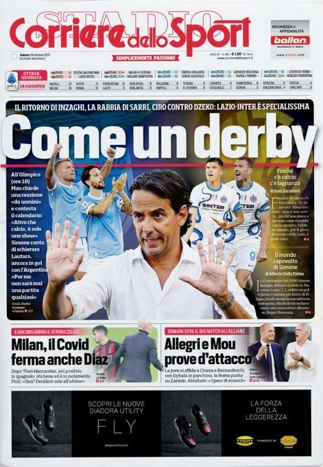 سلطت كوريري الضوء على مواجهة فريقي إنتر ميلان ضد نظيره لاتسيو اليوم، وذلك بعنوان إنها مثل الديربي، عودة إنزاجي، غضب ساري، تشيرو ضد دزيكو.