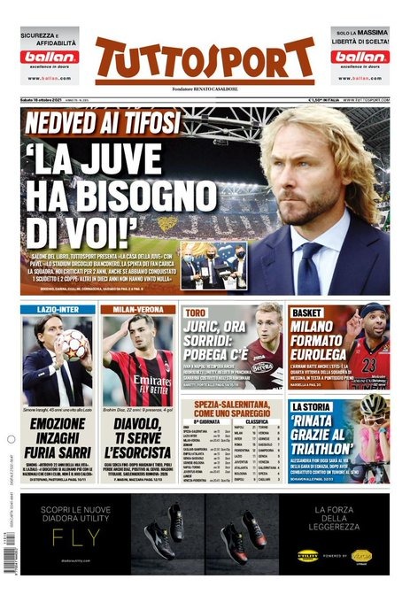 عنونت الصحيفة الإيطالية بـ يوفنتوس بحاجة إليكم!، في ذكر تصريح الأسطورة نيدفيد لجماهير يوفنتوس لدعم الفريق في الوقت الحالي لاستعادة موقعه في ترتيب الدوري الإيطالي بعد السقوط في الفترة الماضية ببداية المسابقة.