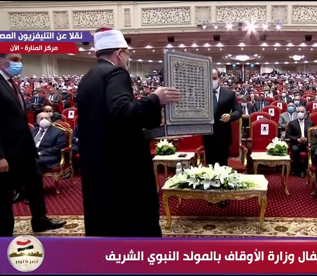 أهدى الدكتور محمد مختار جمعة وزير الأوقاف، الرئيس عبد الفتاح السيسي، مصحفًا، خلال افتتاحية احتفال الوزارة بالمولد النبوي الشريف.