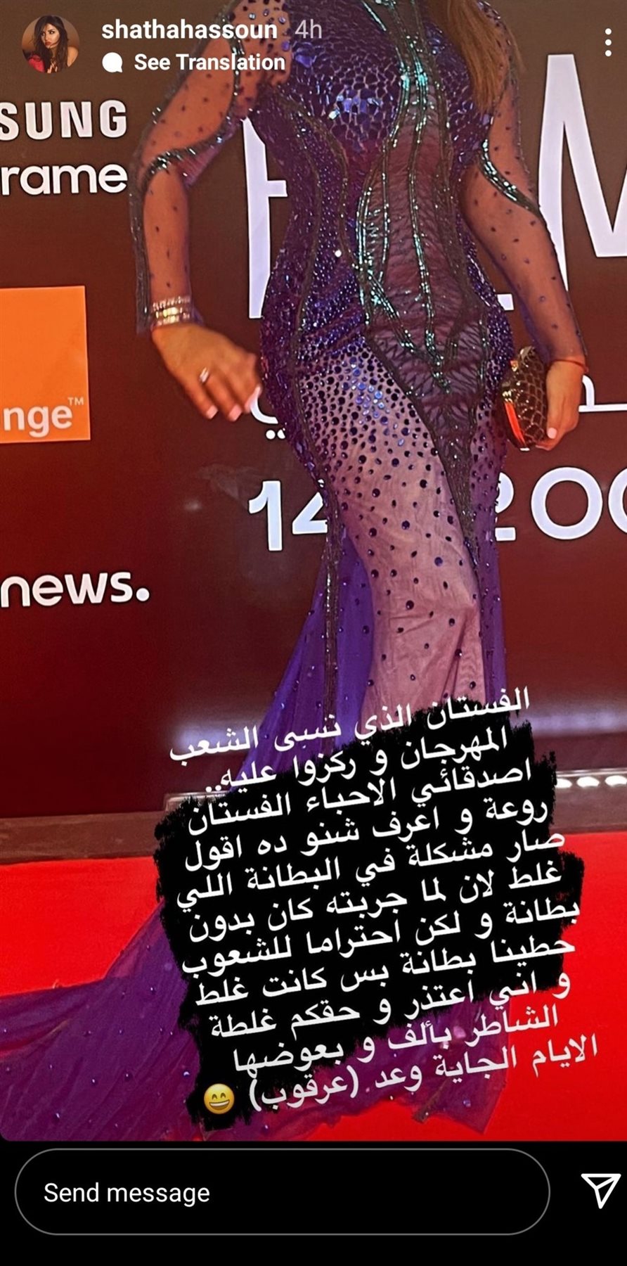 ردت شذى حسون على انتقادات الجمهور في ستوري نشرتها عبر حسابها الرسمي بموقع الصور والفيديوهات إنستجرام، وكتبت فيها: الفستان الذي نسى الشعب المهرجان وركزوا عليه.. أصدقائي الأحباء الفستان روعة وأعرف شنو ده أقول، صار مشكلة في البطانة اللي غلط لأن لما جربته كان دون بطانة، ولكن احترامًا للشعوب حطينا بطانة بس كانت غلط، وأني أعتذر وحقكم غلطة الشاطر بألف وبعوضها الأيام الجاية وعد (عرقوب).