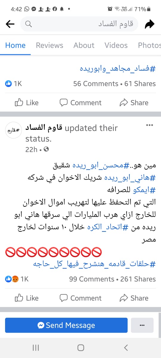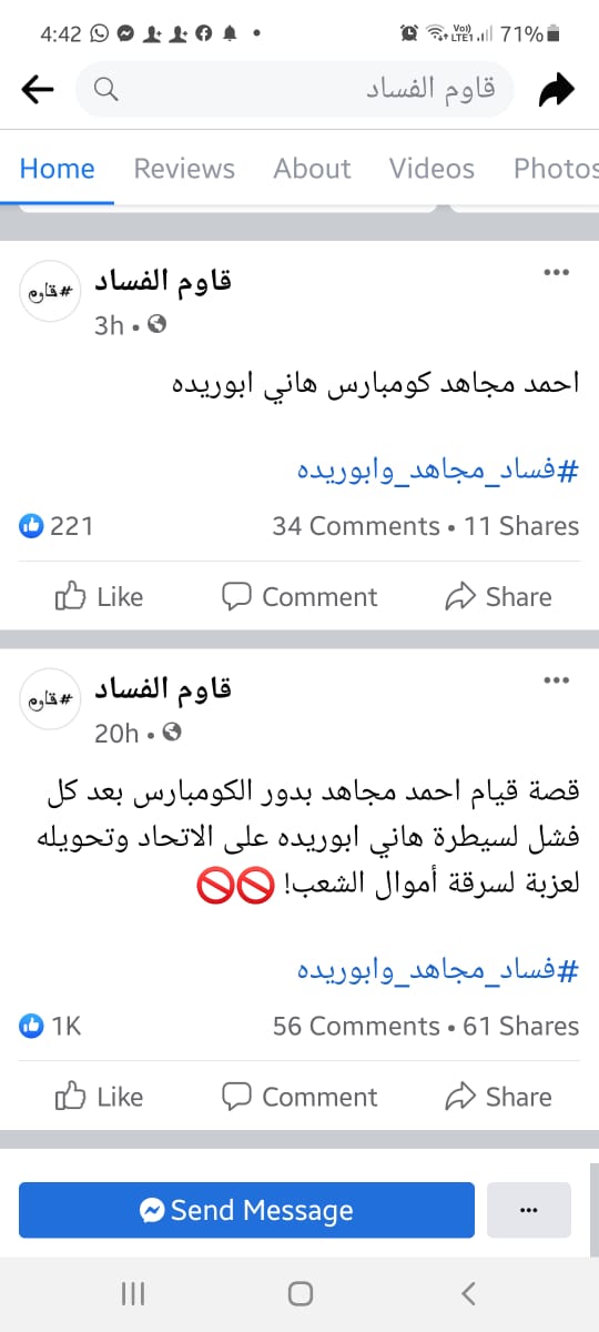 وعن هاشتاج مخالفات اتحاد الكرة تجاوز عدد المتابعين لصفحة قاوم الفساد على فيس بوك نحو 14.1 ألف شخص خلال دقائق من تدشينها، وتحدثت الصفحة عن قصة قيام أحمد مجاهد في تحويل اتحاد كرة القدم إلى عزبة وسرقة أموال الشعب حسب المنشور ولاقى تفاعل المئات بخلاف عشرات التعليقات التي طالبت بالمحاسبة وأسئلة من نوعيات من وراءهم ومن يساندهم.