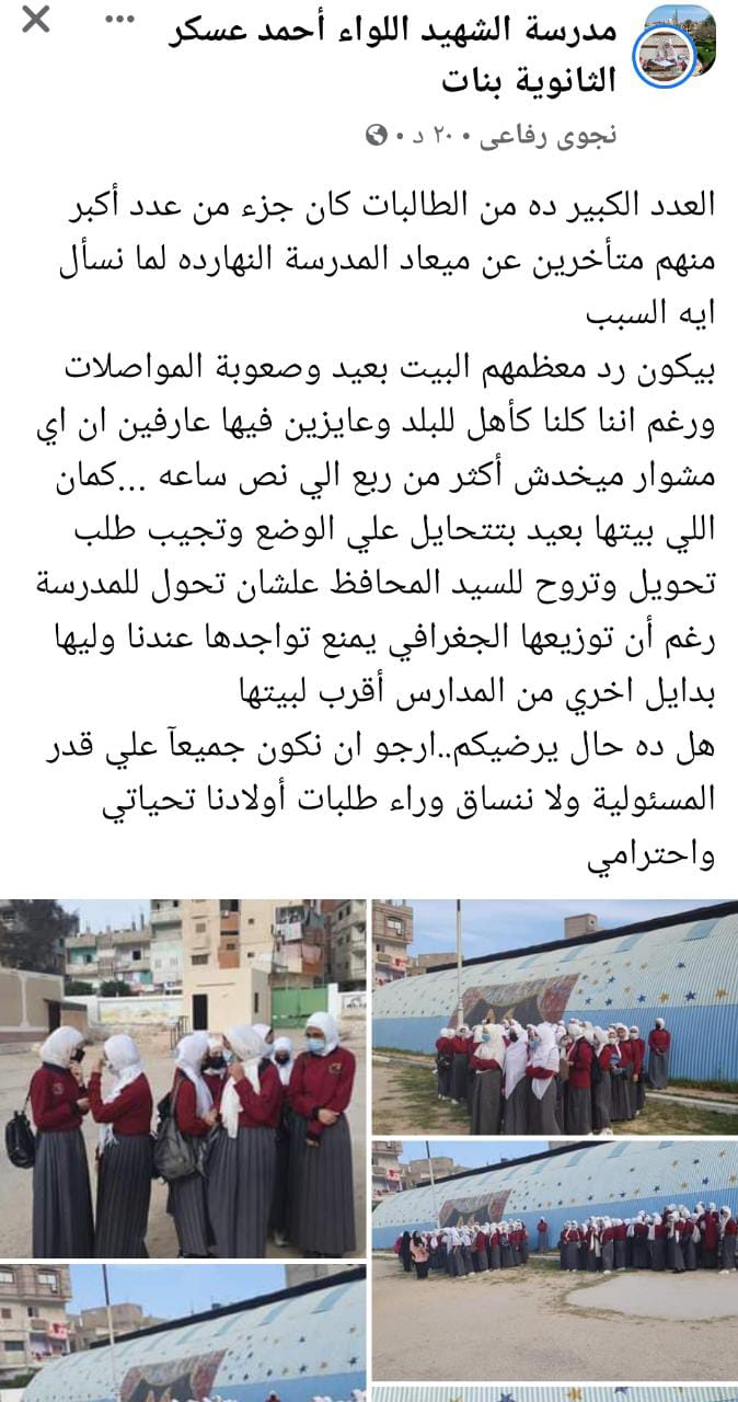 وقالت نجوى رفاعي، مديرة المدرسة عبر صفحة المدرسة على فيس بوك إن ظاهرة تأخر الطالبات عن طابور الصباح أصبحت متكررة وعند سؤال الطلبات يكون ردهن إن المنزل بعيد عن المدرسة وصعوبة المواصلات.