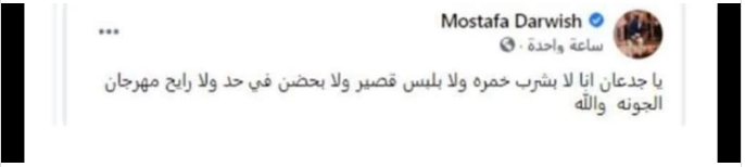 كشف الفنان مصطفى درويش عدم مشاركته في الدورة الخامسة من مهرجان الجونة السينمائي، وقال على حسابه الشخصي بفيسبوك: يا جدعان أنا لا بشرب خمرة ولا بلبس قصير ولا بحضن في حد ولا رايح مهرجان الجونة والله.