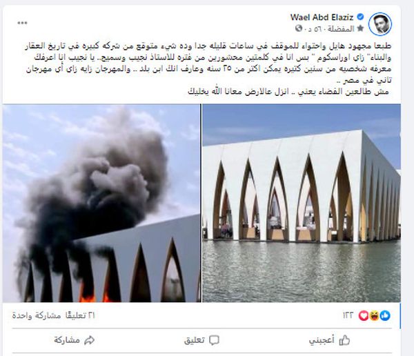 علق الفنان وائل عبد العزيز، على حريق بلازا الجونة السينمائي، ونشر بعض الصور لترميمات القاعة، وكتب عليها: طبعا مجهود هايل واحتواء للموقف في ساعات قليلة جدا وده شيء متوقع من شركة كبيرة في تاريخ العقار والبناء زي أوراسكوم.