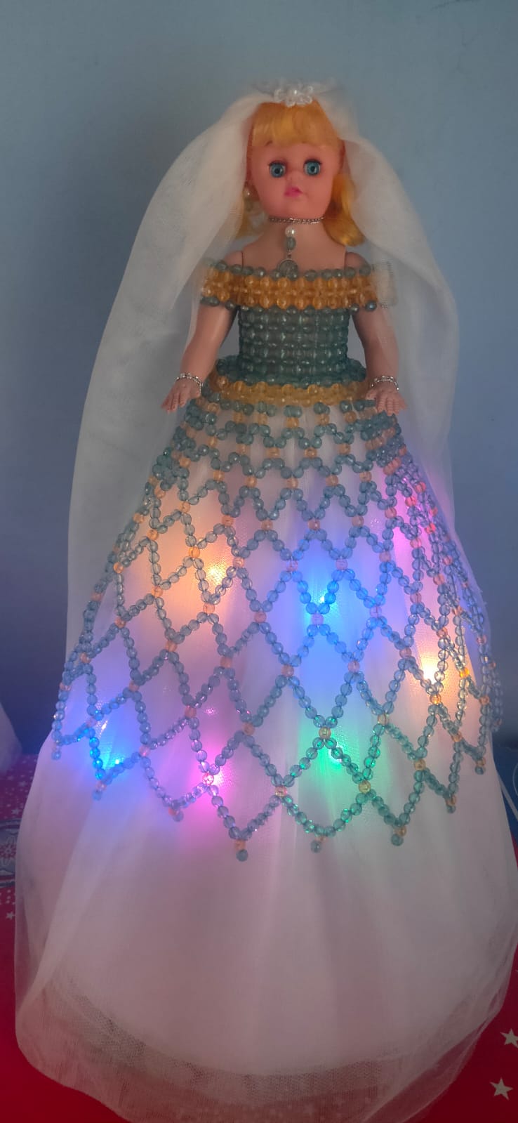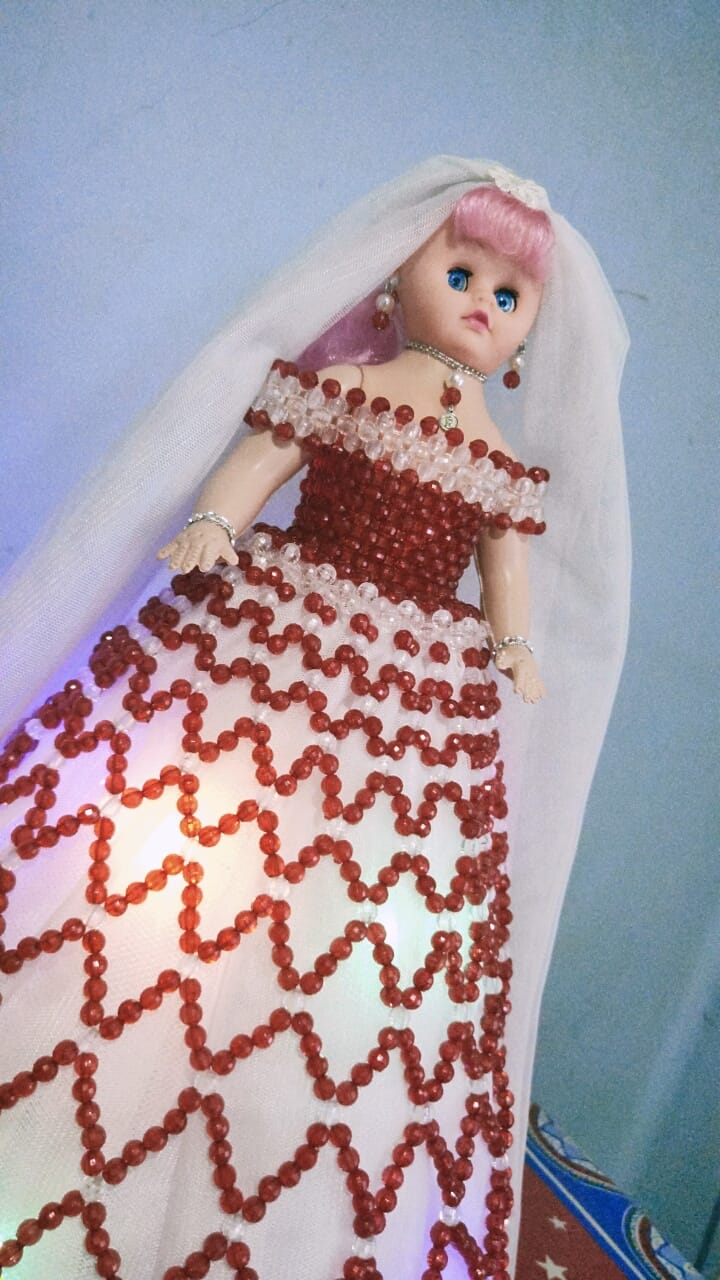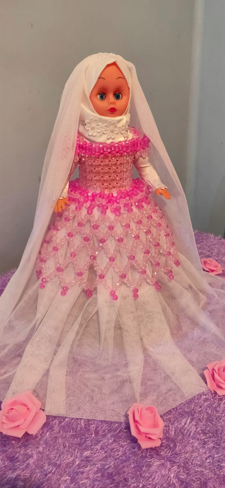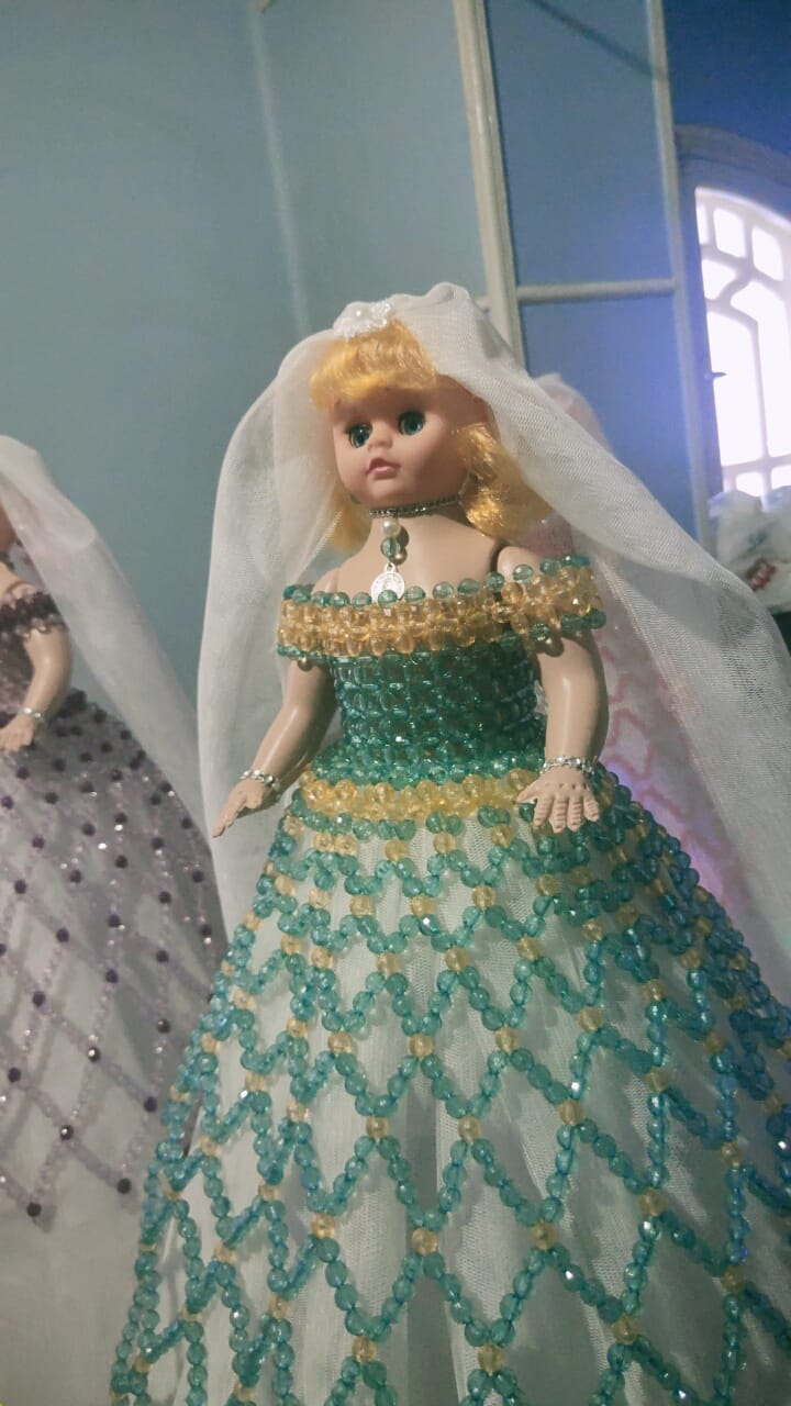 وتابعت عبد السلام: العروسة بتاخد معايا نحو يومين شغل لو الحجم الكبير، بالذات لأن فيها تفاصيل كثير،موضحة أنها تستخدم بجانب الكريستال، مواد أخرى كالخرز، والتل، مؤكدة أن عرائس التل من الممكن نزع الخرز من الفستان وغسله بسهولة.