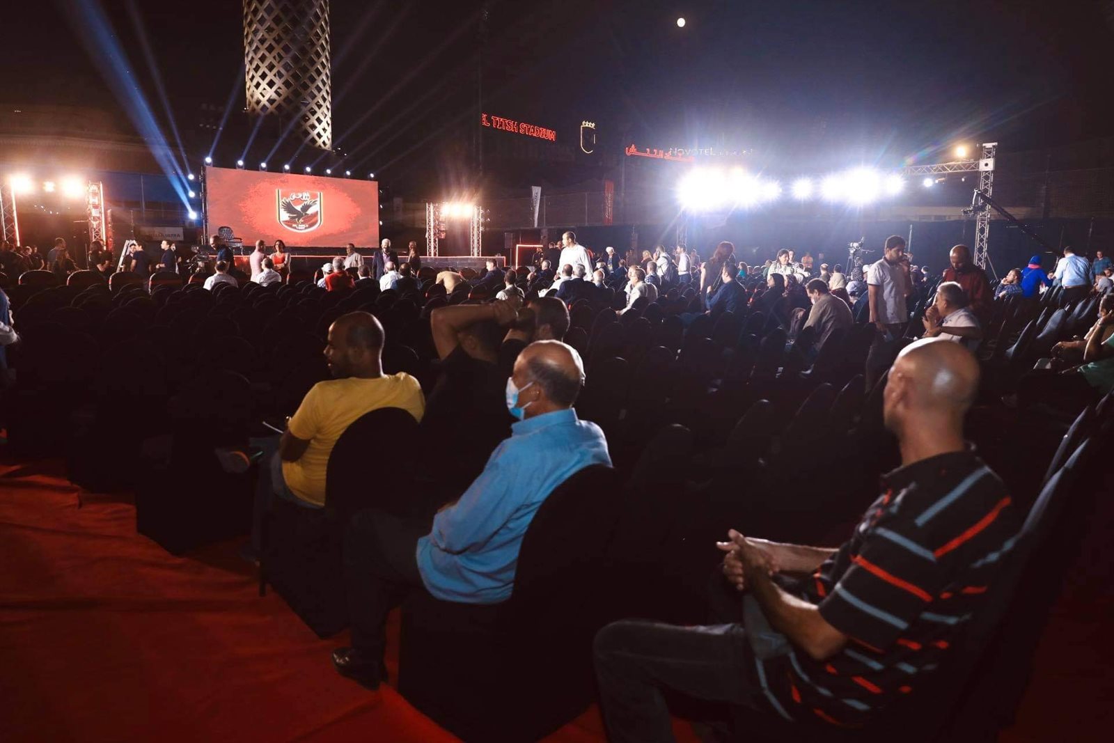 وتوافد أعضاء النادي الأهلي على المكان المخصص داخل المقر ‏الرئيسي بالجزيرة، لحضور المؤتمر العام لـمحمود الخطيب، رئيس مجلس إدارة النادي.