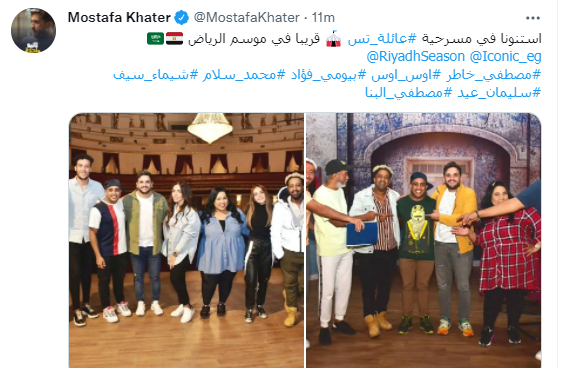 وكتب مصطفى خاطر تغريدة عبر حسابه الخاص على موقع تويتر، قائلًا: استنونا في مسرحية عائلة تس...قريبًا في موسم الرياض.