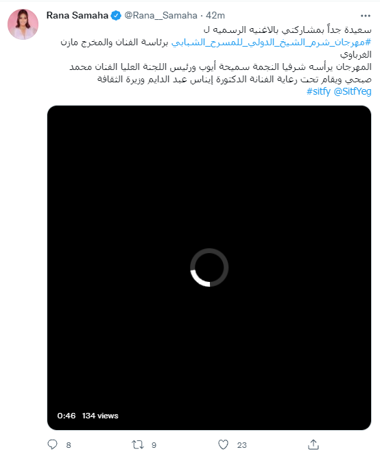 ونشرت رنا سماحة، مقطع فيديو، عبر حسابها على تويتر، وعلقت عليه: سعيدة جدًا بمشاركتي في الأغنية الرسمية لمهرجان شرم الشيخ الدولي للمسرح الشبابي، برئاسة الفنان والمخرج مازن الغرباوي.