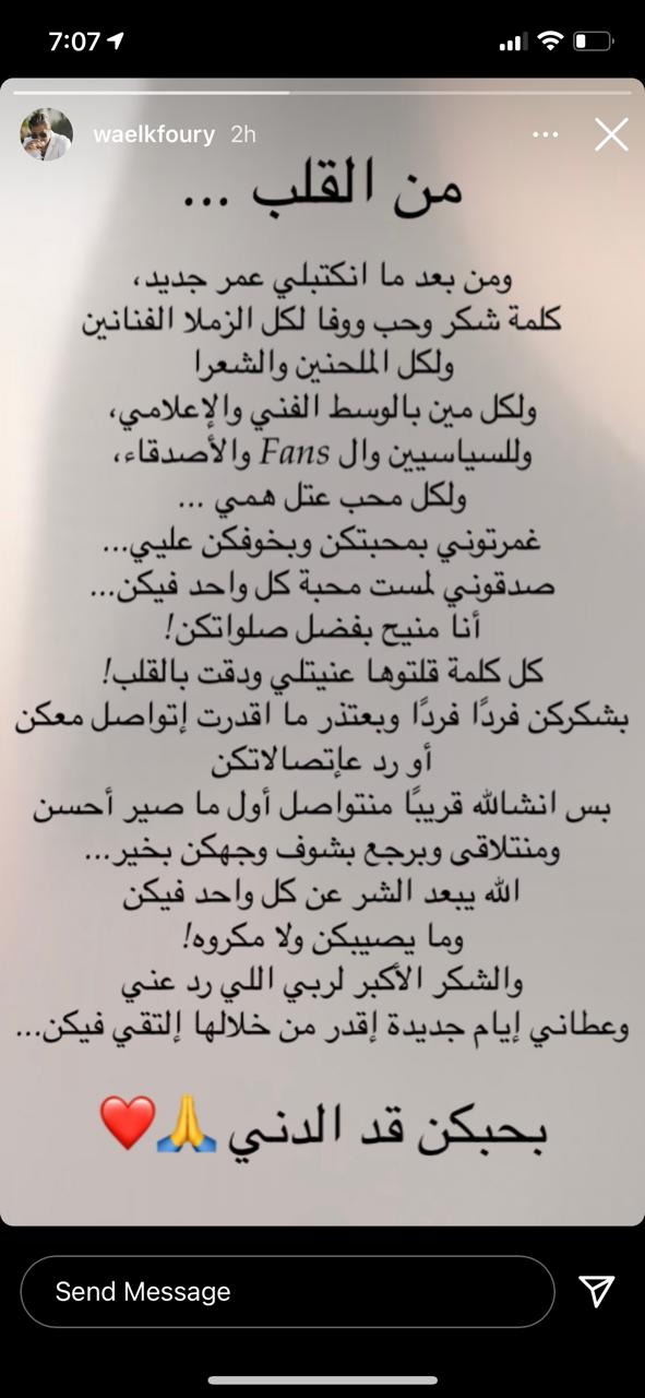 وأشار إلى أنه سيطمئن الجمهور بنفسه قريبًا؛ بعد ما تتحسن حالته الصحية: إن شاء الله قريبًا منتواصل أول ما يصير أحسن، ومنتلاقي وبرجع بشوف وجهكن بخير، الله يبعد الشر عن كل واحد فيكن وما يصيبكم ولا مكروه، والشكر الأكبر لربي اللي رد عني وعطاني أيام جديدة أقدر من خلالها إلتقي فيكن.