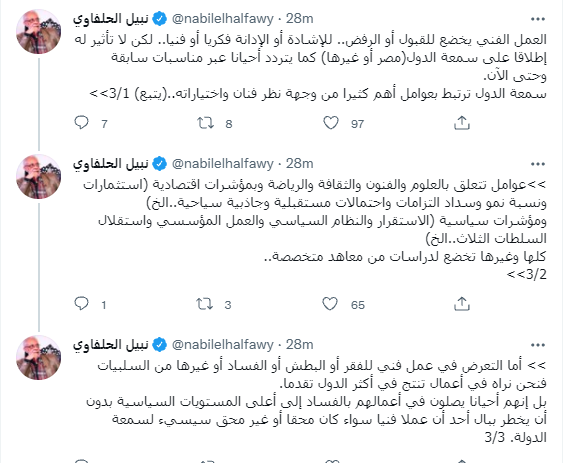 وكتب تبيل الحلفاوي في تغريدة عبر حسابه على تويتر: العمل الفني يخضع للقبول أو الرفض.. للإشادة أو الإدانة فكريًا أو فنيًا.. لا تأثير له إطلاقًا على سمعة الدول مصر أو غيرها، كما يتردد أحيانا عبر مناسبات سابقة وحتى الآن.
