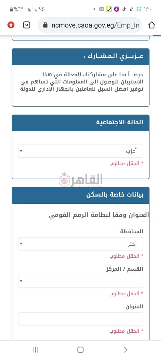 وأرسل الجهاز المركزي للتنظيم والإدارة الرابط وكلمة السر لجميع الموظفين المنتقلين للعمل بالعاصمة الإدارية الجديدة، والمتقدمين للحصول على وحدات سكنية بمشروع سكن مصر، لملأ الاستمارة المعدة لذلك.