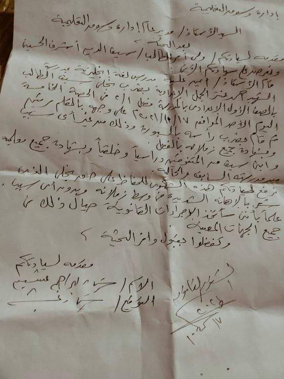 وطالبت ولية الأمر من خلال القاهرة 24، بوصول لحل هذه المشكلة حتى يتمكن ابنها من دخول المدرسة، لافتة إلى أنه خائف من ذهابه لتكرار ضربه مرة أخرى.