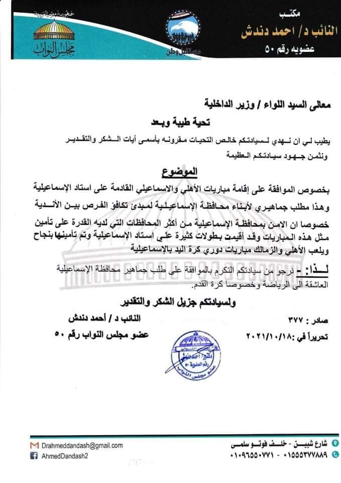 أرسل الدكتور أحمد دندش، عضو مجلس النواب بالإسماعيلية، خطابا إلى اللواء محمود توفيق وزير الداخلية، للموافقة على إقامة مواجهة الأهلي والإسماعيلي القادمة على استاد الإسماعيلية.