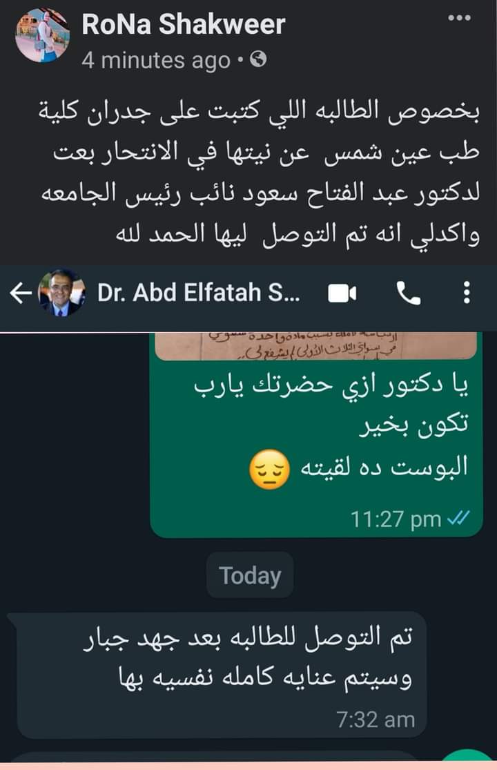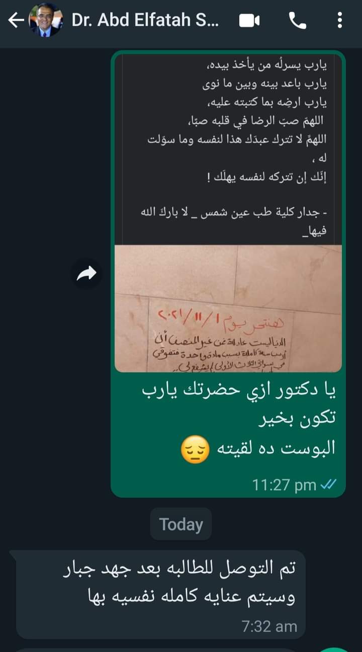 كما رد الدكتور عبدالفتاح سعود نائب رئيس جامعة عين شمس لشئون التعليم والطلاب على سؤال رنا شوقير، أحد العاملين بجامعة عين شمس، بأنه تواصل مع الطالبة بعد جهد كبير وسيتم العناية النفسية بها.