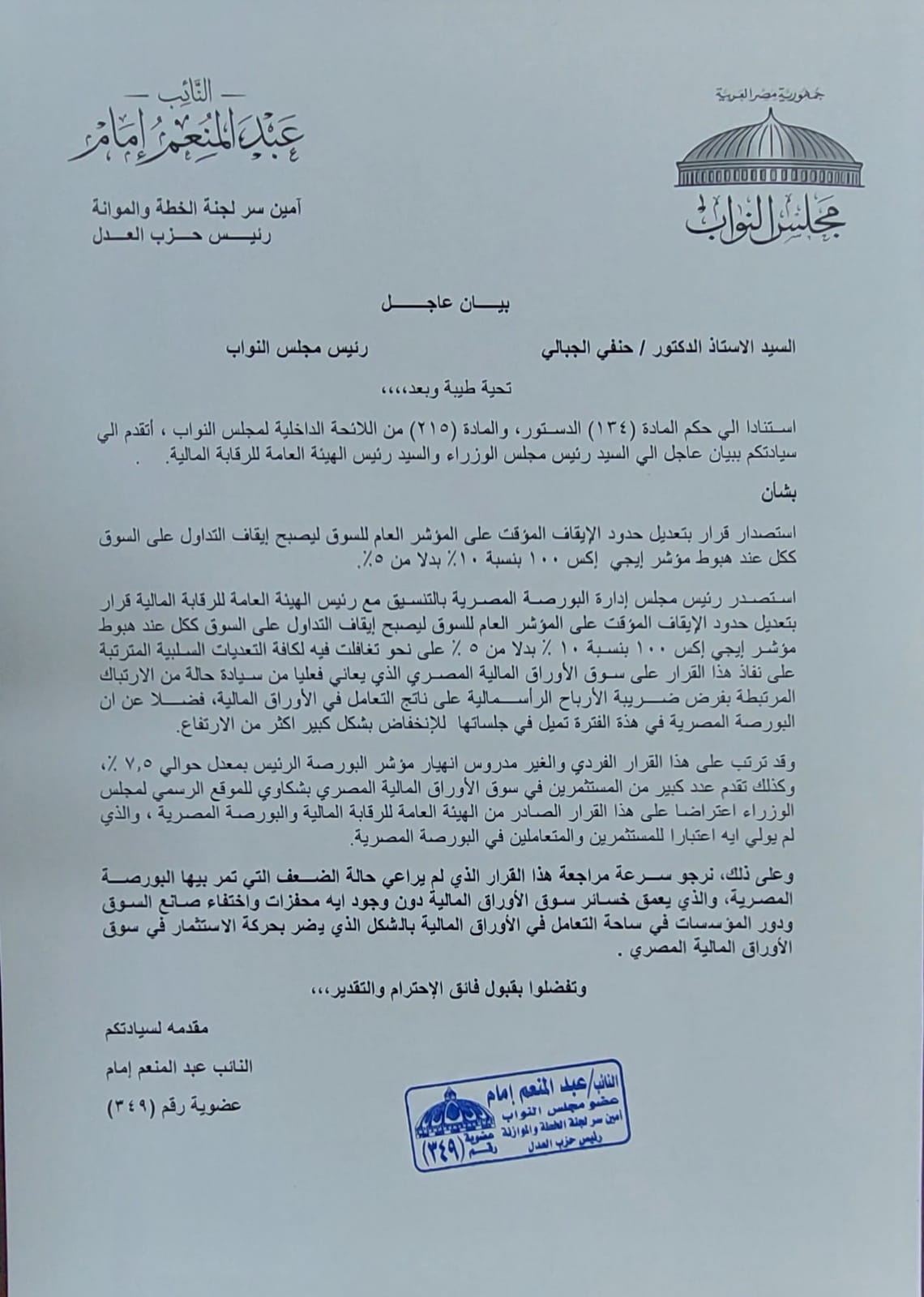 وتقدم إمام اليوم ببيان عاجل موجه إلى رئيس مجلس الوزراء ورئيس الهيئة العامة للرقابة المالية، في أول تحرك برلماني خاص بهذا الشأن مطالبا بمراجعة هذا القرار المتخذ من رئيس مجلس إدارة البورصة ورئيس هيئة الرقابة المالية، الذي تم فيه تعديل حدود الإيقاف المؤقت على المؤشر العام للسوق ليصبح إيقاف التداول على السوق ككل عند هبوط مؤشر إيجي إكس100 بنسبة10%بدلا من 5%.