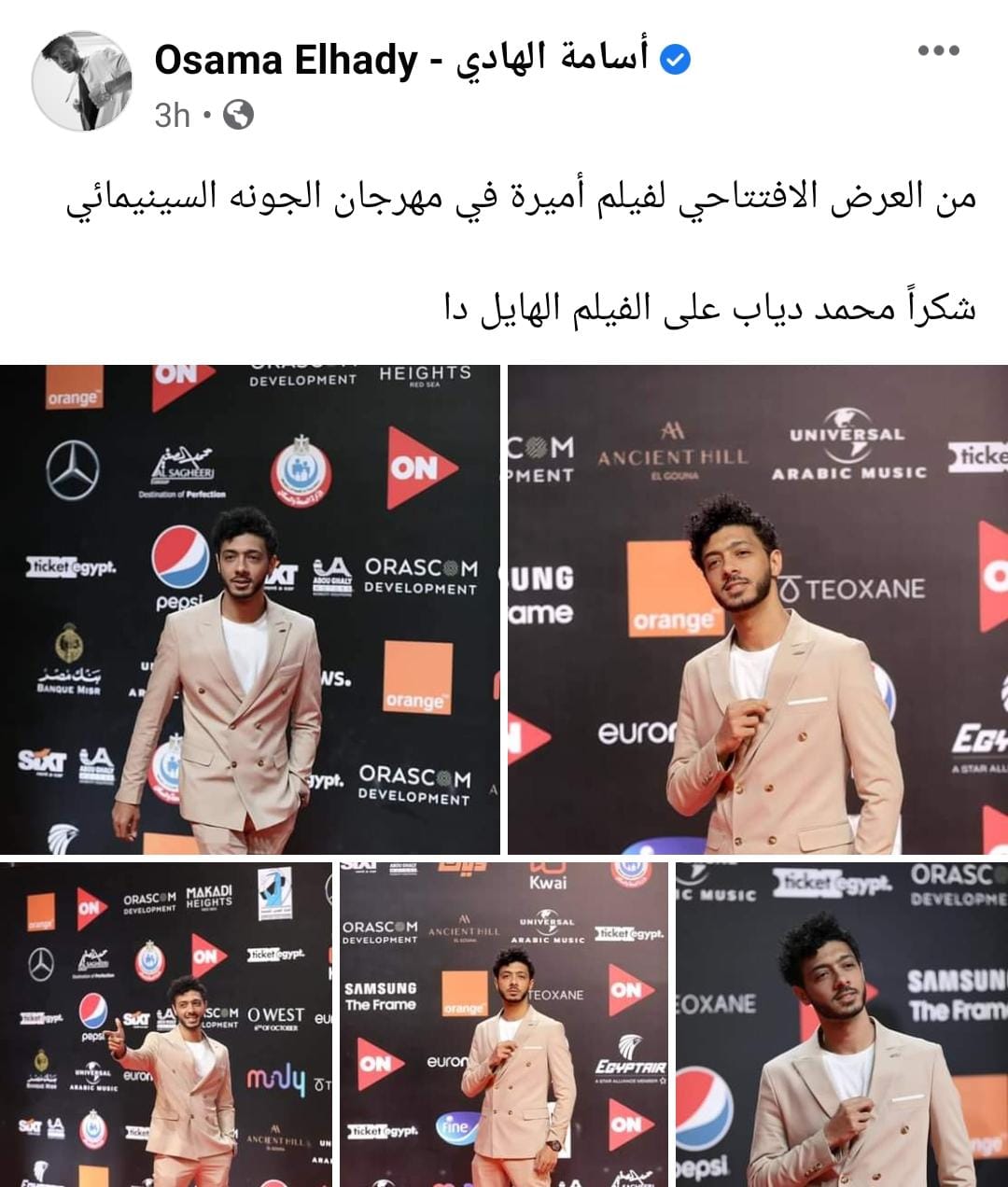 ونشر الفنان أسامة الهادي صورة له من على الريد كاربت في سادس أيام مهرجان الجونة السينمائي أمس عبر صفحته الرسمية على موقع فيس بوك معلقًا: من العرض الافتتاحي لـ فيلم أميرة، شكرًا محمد دياب على الفيلم الهايل ده، وأسامة الهادي ممثل ومغني شاب، وشارك في مسلسل لعبة نيوتن الذي عرض في الماراثون الرمضاني الماضي 2021 في دور شامبا.