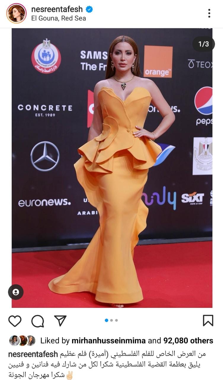 نشرت الفنانة نسرين طافش، صورًا لها من على ريد كاربت من افتتاح العرض الخاص لفيلم أميرة أمس معلقة: من العرض الخاص للفيلم الفلسطيني أميرة، فيلم عظيم يليق بعظمة القضية الفلسطينية، شكرًا لكل من شارك به.